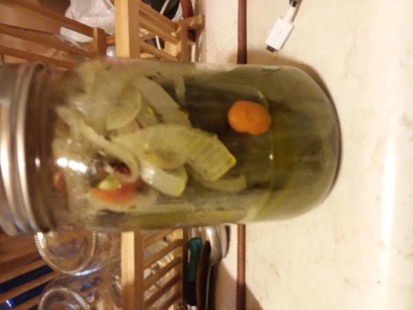 Luego se añaden los ajos pelados, las zanahorias peladas y cortadas y rodajas y los chiles, a los que se les hace un corte en cruz en la punta. Se fríen durante 5 minutos más y se añade el vinagre, la sal, la pimienta y las yerbas de olor, se deja hervir 10 minutos más.