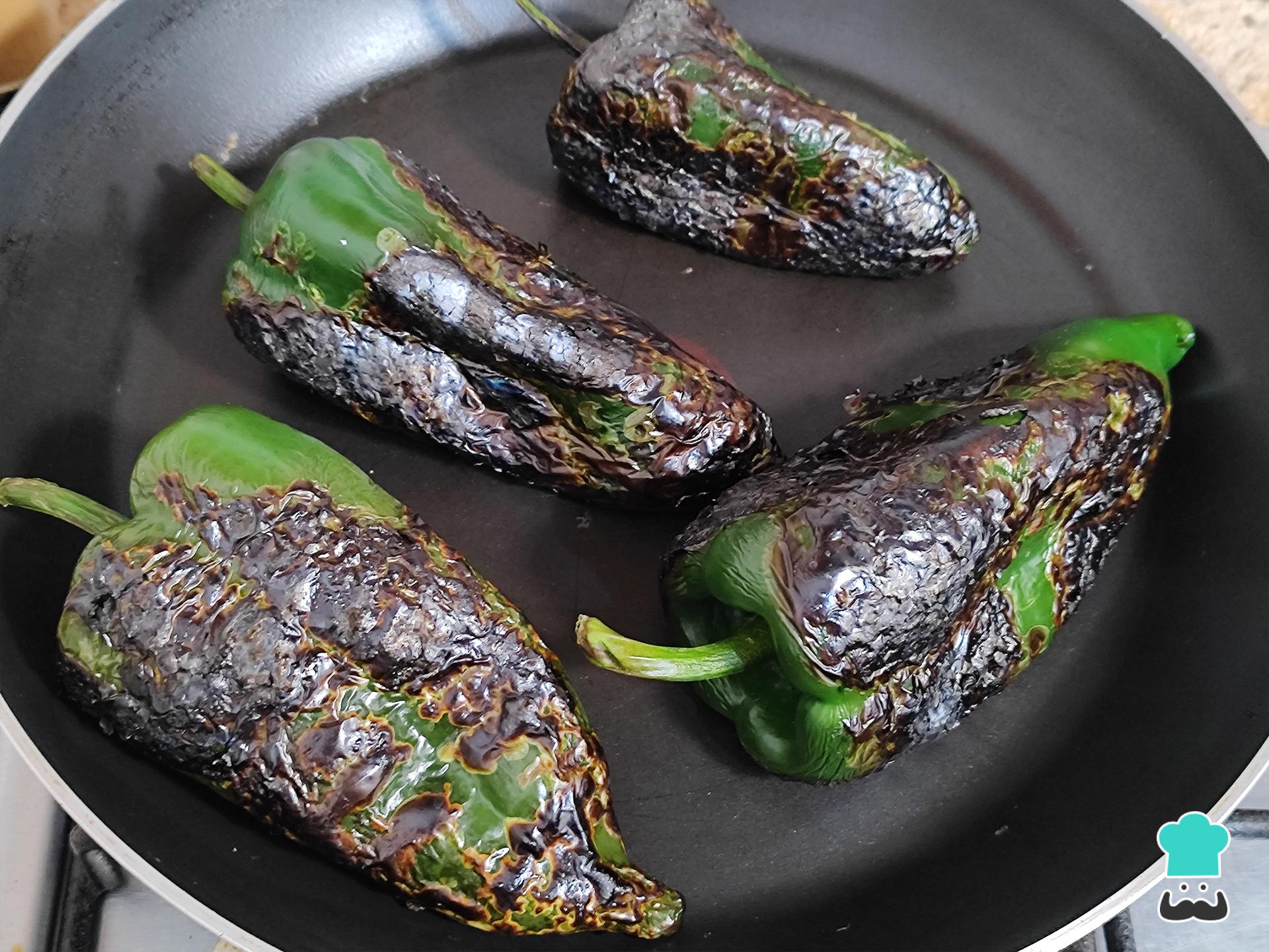 Para empezar la receta, asa los chiles poblanos sobre la estufa, en un comal o sartén hasta que la piel esté tostada y se desprenda fácil, da vuelta constantemente para lograr un asado uniforme.