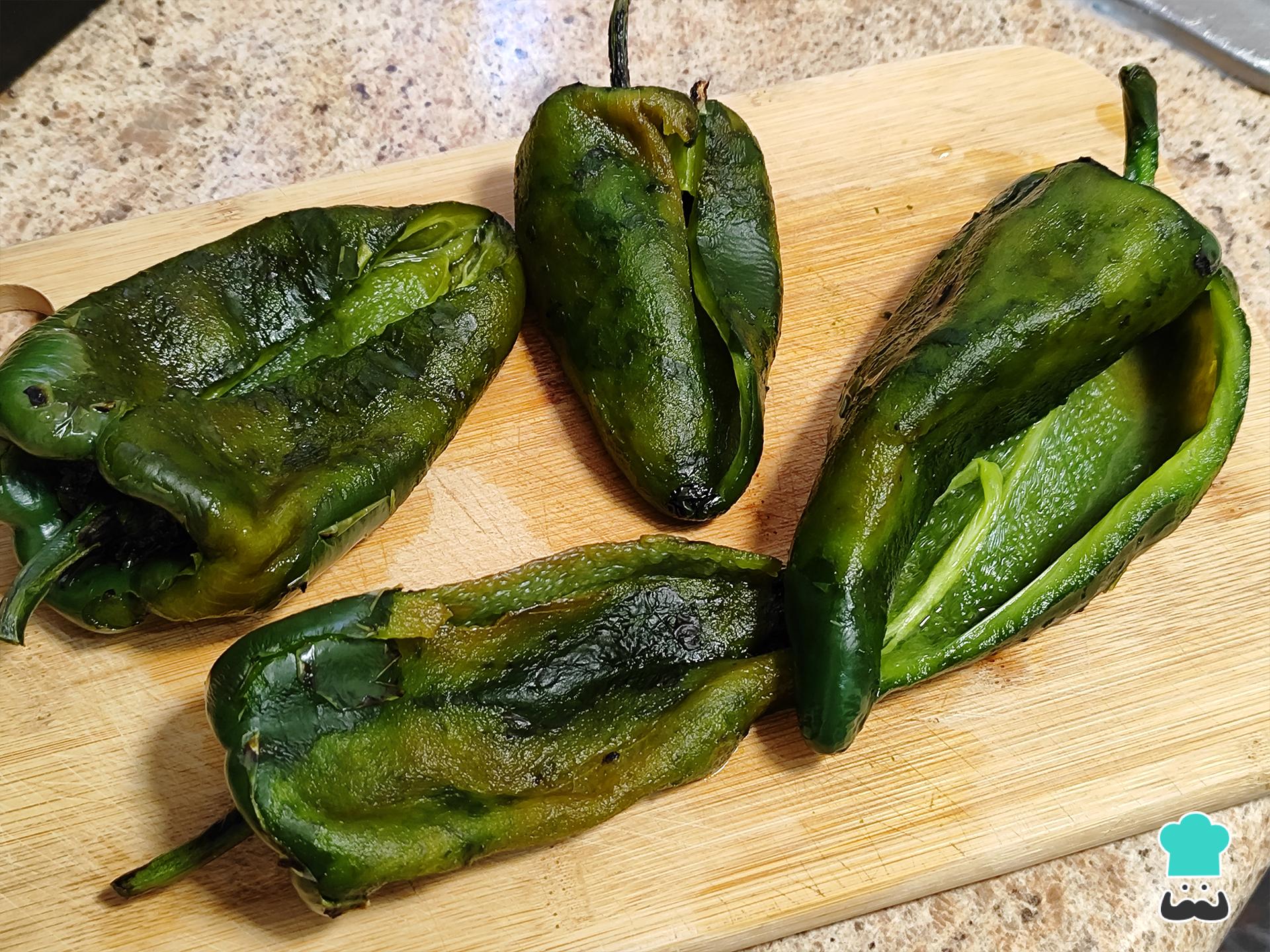 Coloca los chiles en una bolsa de plástico durante 10 minutos y, después, retira la piel. Haz una abertura y retira las semillas con cuidado.
