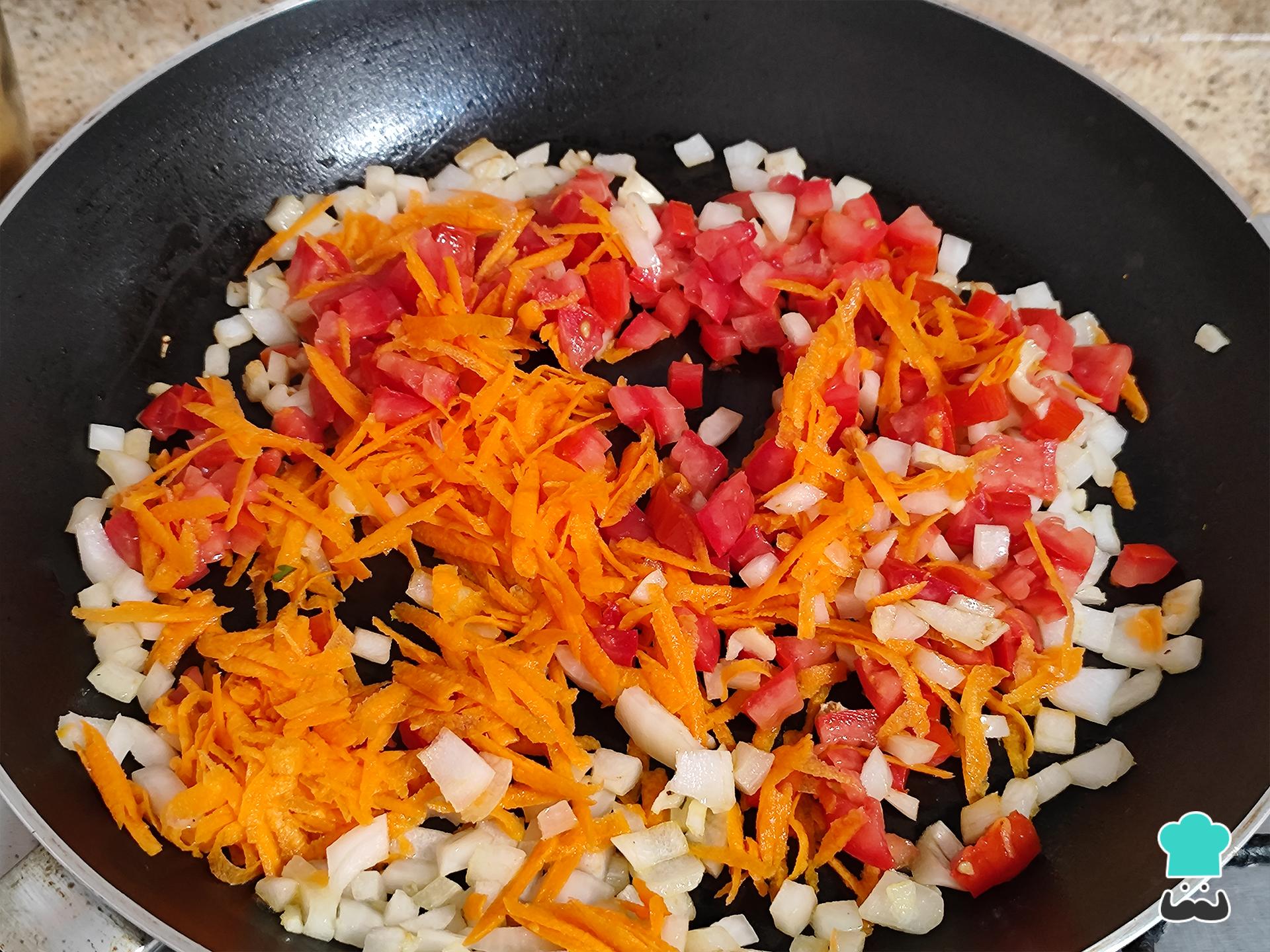 Prepara el relleno. En una sartén calienta un poco de aceite y sofríe la cebolla y el ajo, cuando estén ligeramente dorados añade el jitomate y la zanahoria. Cocina por 5 minutos removiendo constantemente.