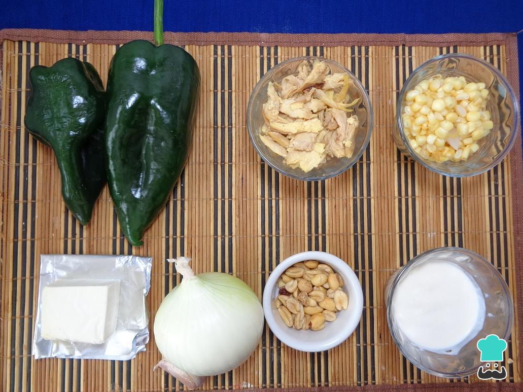 Aquí puedes ver los ingredientes que necesitarás para elaborar estos deliciosos chiles rellenos de pollo con crema de elote.