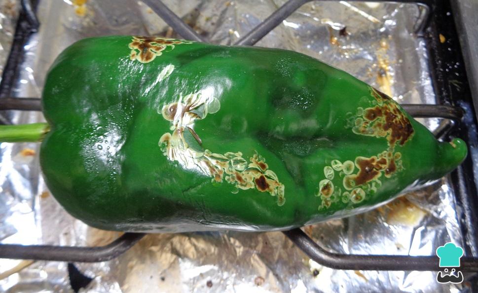 Para comenzar con la preparación de nuestros chiles rellenos de pechuga de pollo, colocamos a fuego directo los chiles poblanos para que se asen muy bien. Una vez completamente asados los colocamos dentro de una bolsa de plástico, la cual sellamos perfectamente, y dejamos reposar un momento.