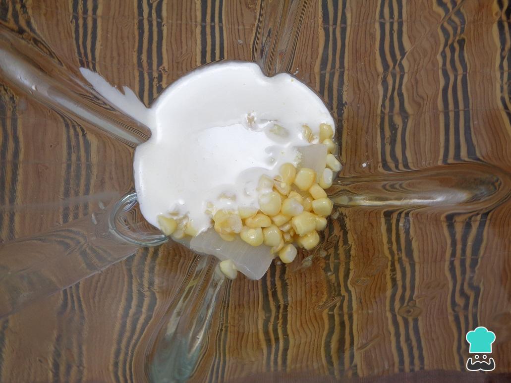 Por otro lado tomamos la crema agria, el elote cocido, la cebolla y el queso crema, y los colocamos en la licuadora. Seguido procedemos a licuar hasta obtener un salsa homogénea y ligera.