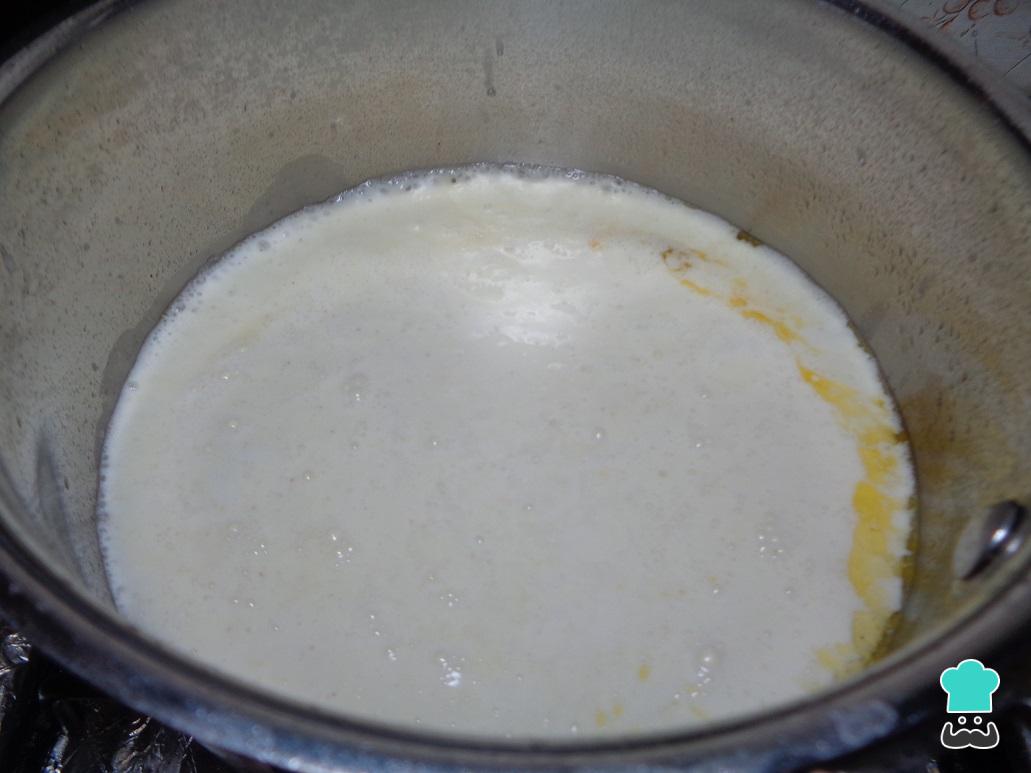 Una vez lista la salsa de los chiles rellenos la colocamos en una cacerola a fuego medio para que se sazone, añadimos una pizca de sal y pimienta, movemos muy bien para integrar todo, y dejamos cocinar a fuego medio por 3 minutos.
