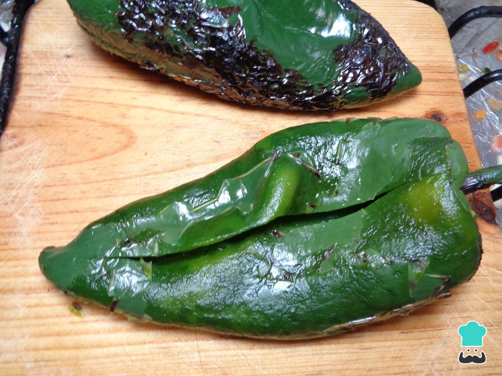Por otro lado, sacamos los chiles poblanos de la bolsa, y bajo el chorro del agua los limpiamos muy bien desprendiéndoles el pellejo, y quitándoles venas y semillas completamente.