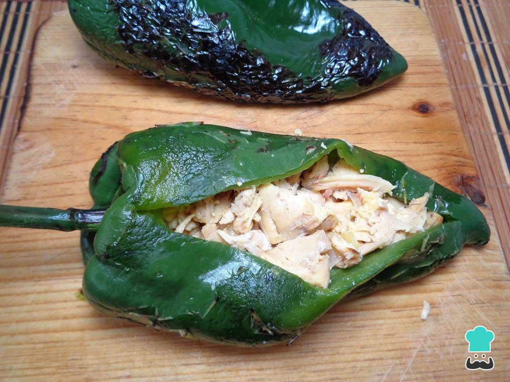 Una vez completamente limpios los chiles, tomamos el pollo deshebrado perfectamente salpimentado y los rellenamos muy bien.
