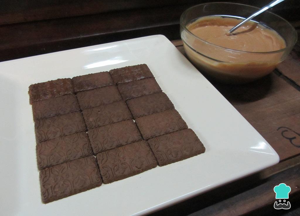 Sobre un molde cuadrado o rectangular comenzamos a ubicar las galletas de chocolate humedecidas, una al lado de la otra. De esta manera formamos la base de la chocotorta argentina.