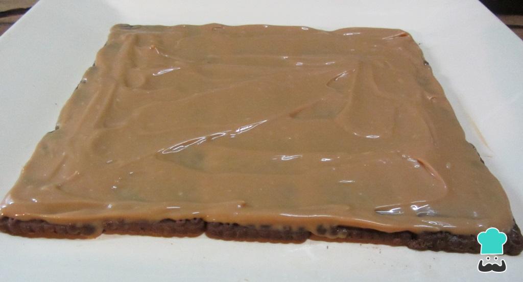 Con una espátula, cubrimos las galletas con la mezcla de dulce de leche y crema. Esta será la primera capa de la chocotorta.