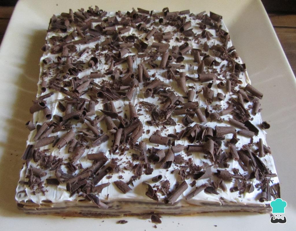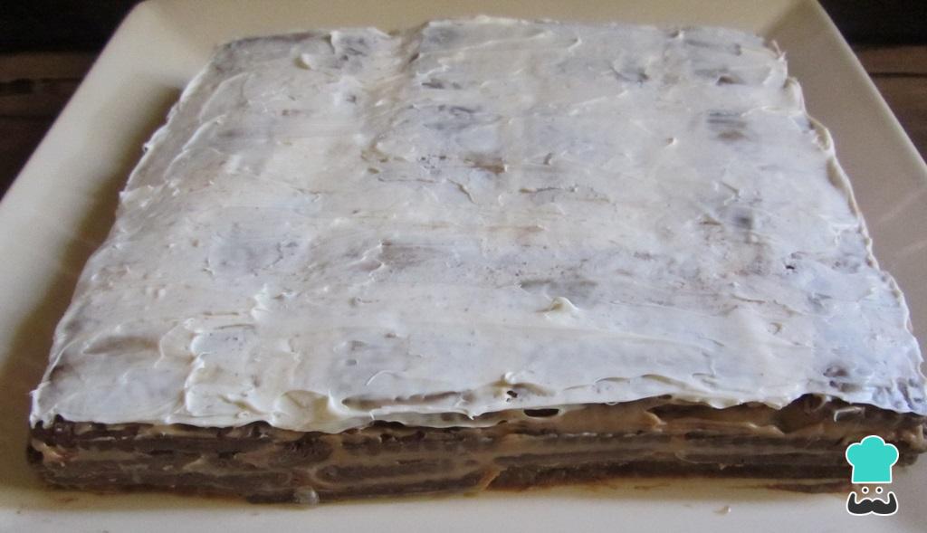 Colocamos otra capa de galletas remojadas en café y cubrimos con la mezcla, y así sucesivamente hasta completar cuatro capas. Cuando terminamos con este procedimiento, finalizamos la chocotorta casera con una capa de crema de leche.