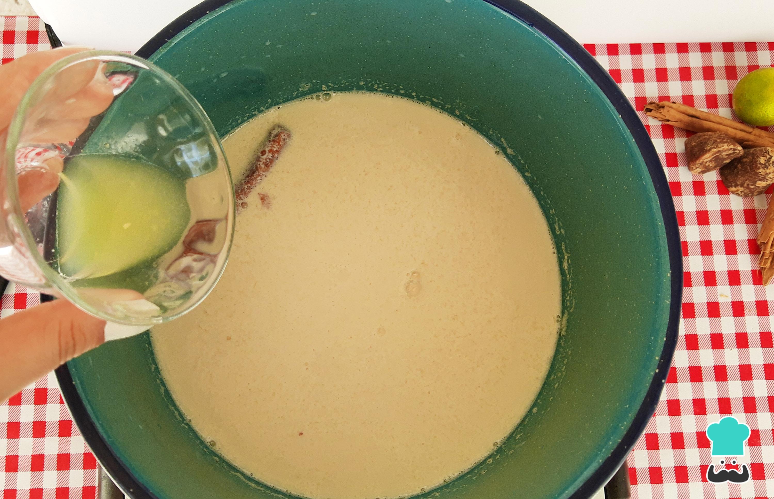 Cuando esté tibia, agrega poco a poco el jugo de limón, mezcla ligeramente, apaga el fuego y deja que repose durante 30 minutos.