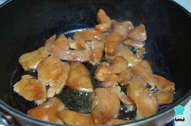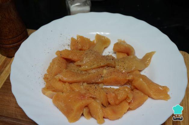 Limpia las pechugas de pollo, retira la piel, córtala en trozos pequeños o en tiras. Añade un poco de sal y pimienta.