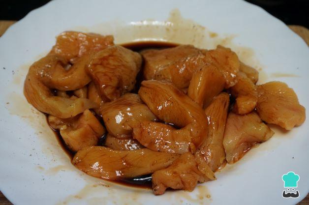 Mezcla la salsa de soja con el azúcar. A continuación, añade el pollo en una fuente y vierte la salsa de soja, mézclalo bien y deja macerando el pollo una hora.