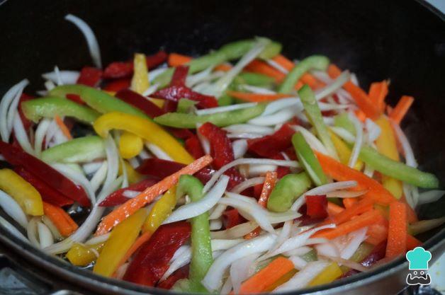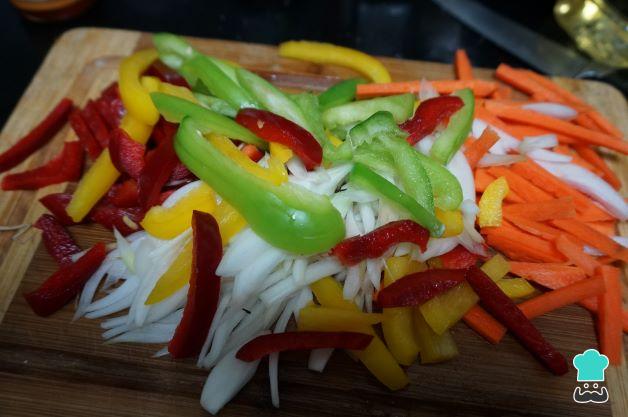 Lava y corta las verduras en tiras. Lava los pimientos y corta en tiras, haz lo mismo con las zanahorias y la cebolla.