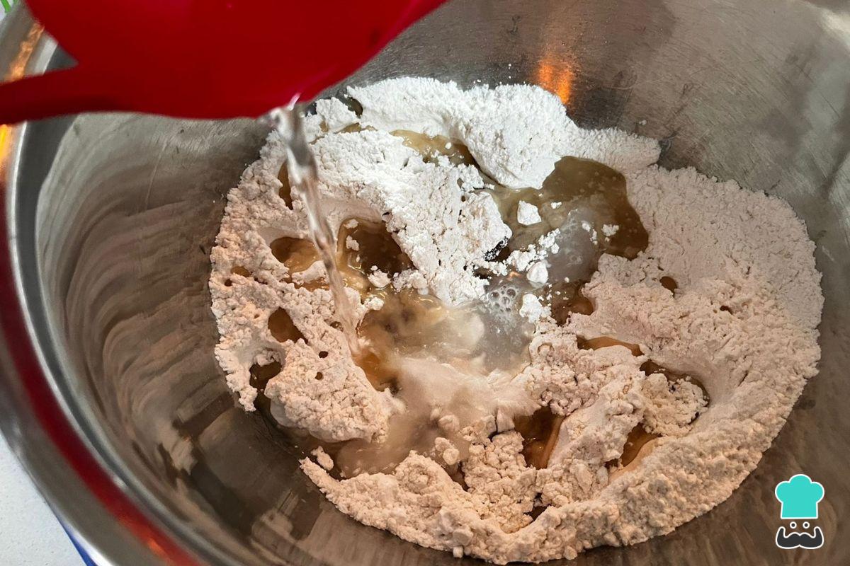 En un bol agrega la harina de trigo, la miel, el bicarbonato de sodio y la sal. También añade la manteca derretida y el agua.