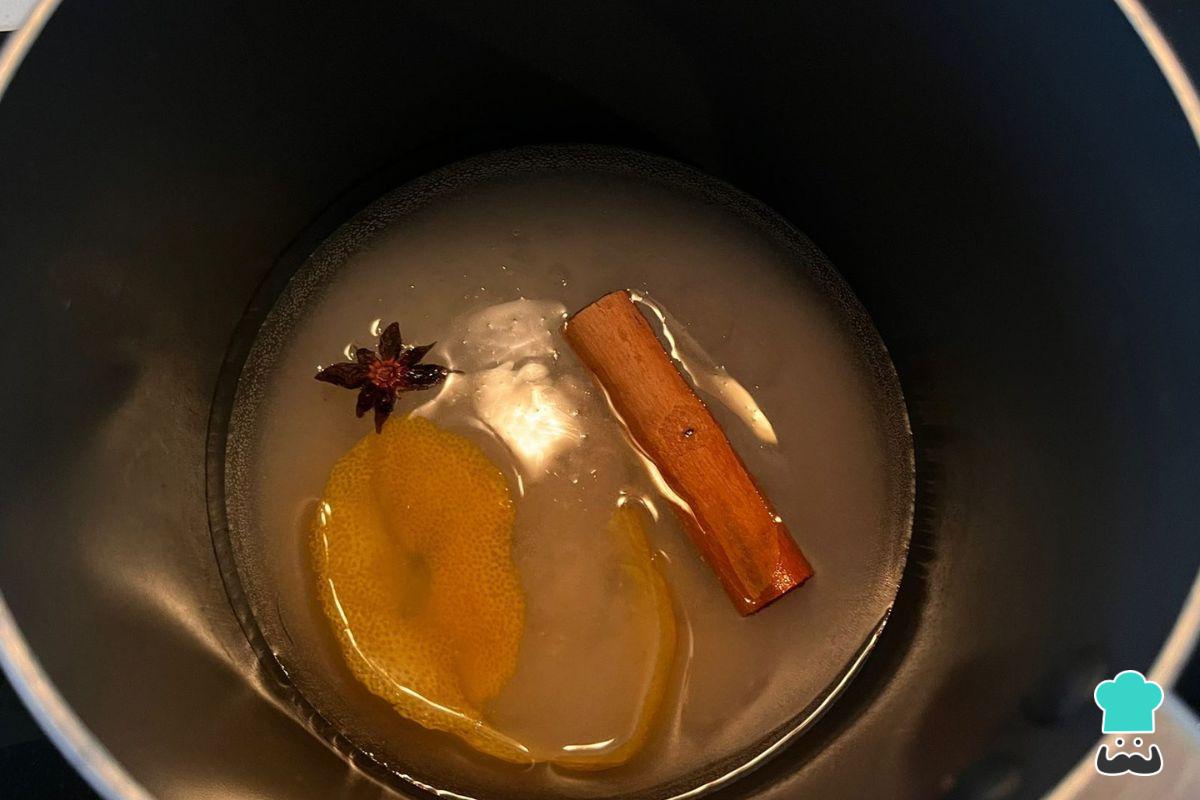 En una olla añade el agua, azúcar, canela, cáscara de limón y anís estrellado a gusto. Añade también el jugo de un limón.