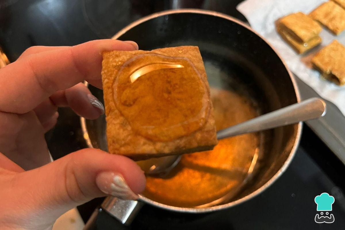 - Al añadir la miel o almíbar en el relleno, evita poner demasiado, ya que un exceso puede humedecer demasiado la masa y afectar su textura crujiente.