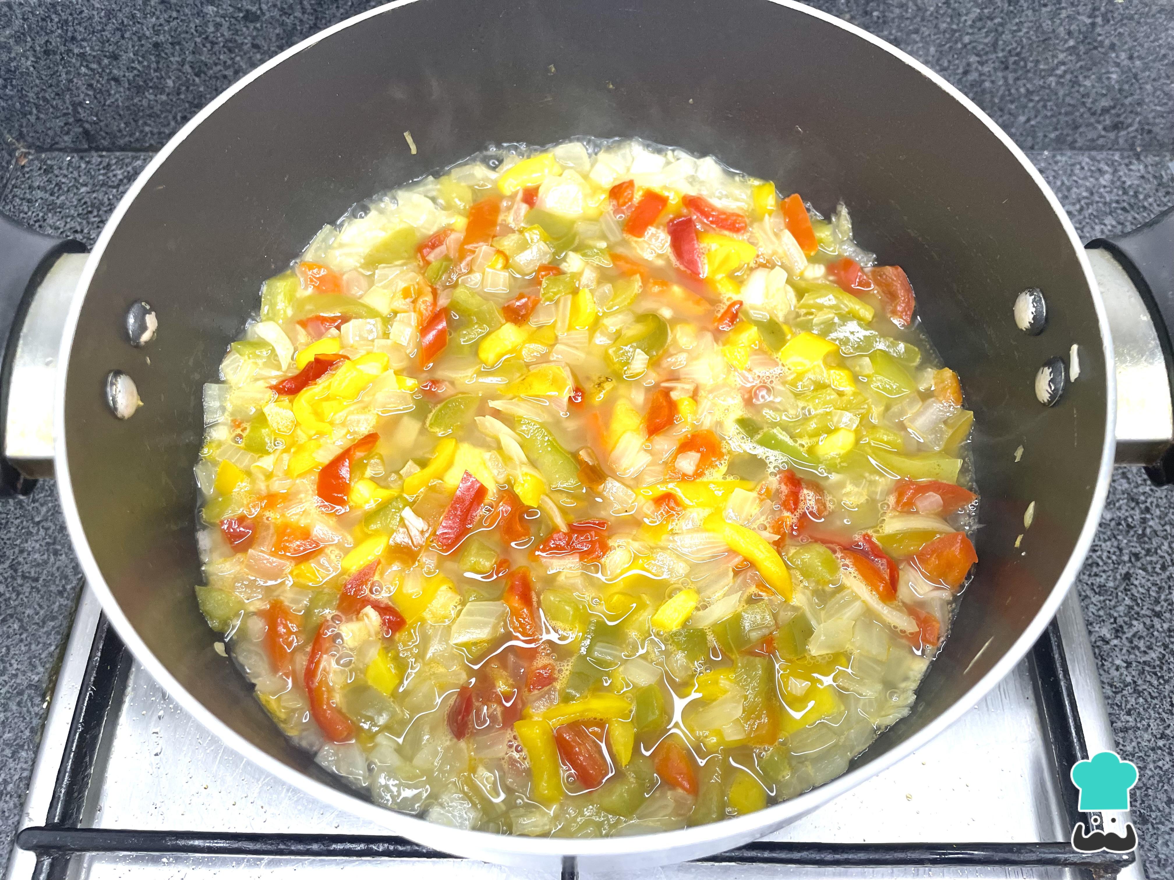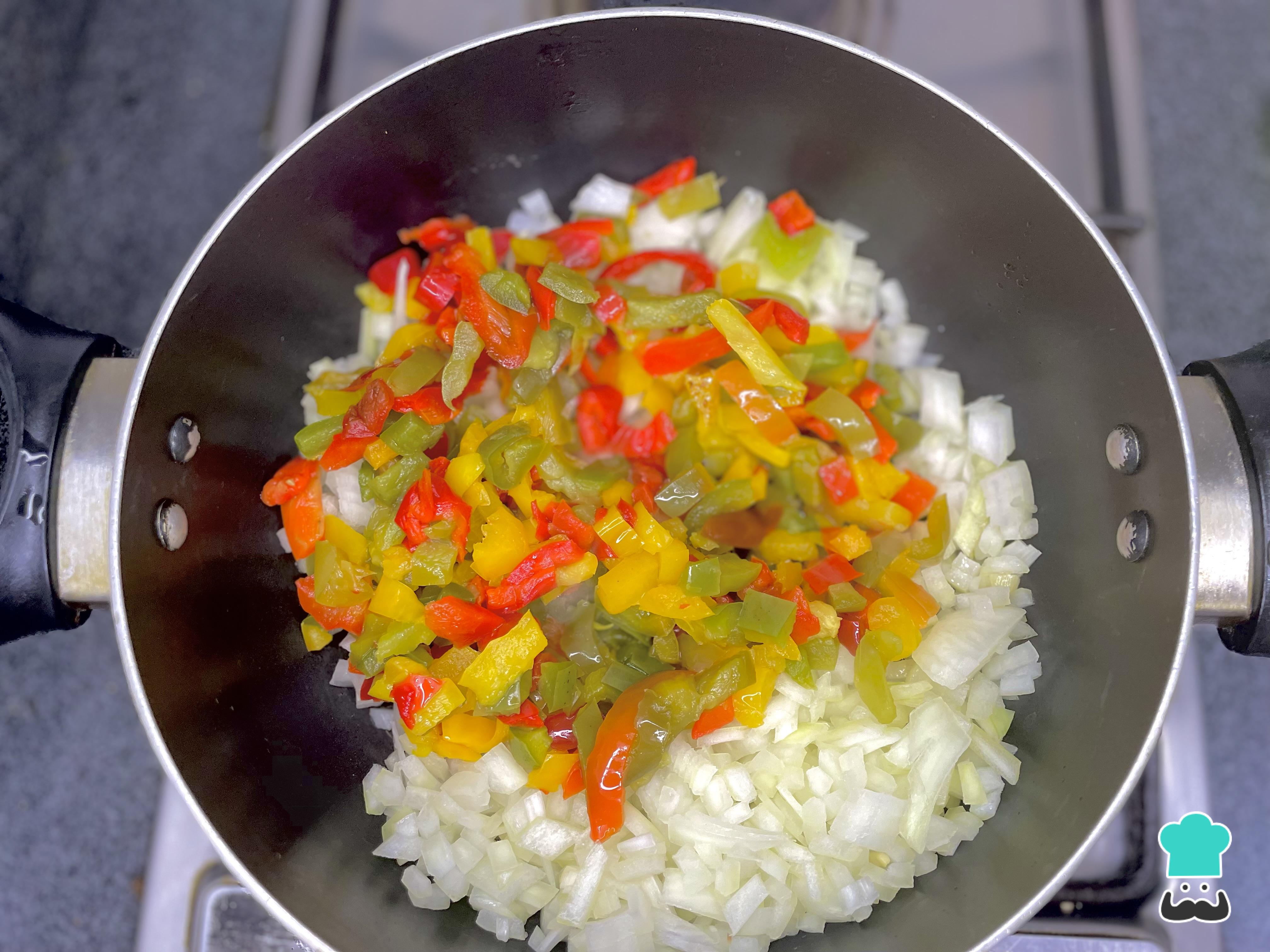 En una sartén grande calienta un poco de aceite a fuego medio. Añade la cebolla, el pimiento rojo y el ajo, sofríe hasta que la cebolla esté transparente y los ingredientes estén bien mezclados.