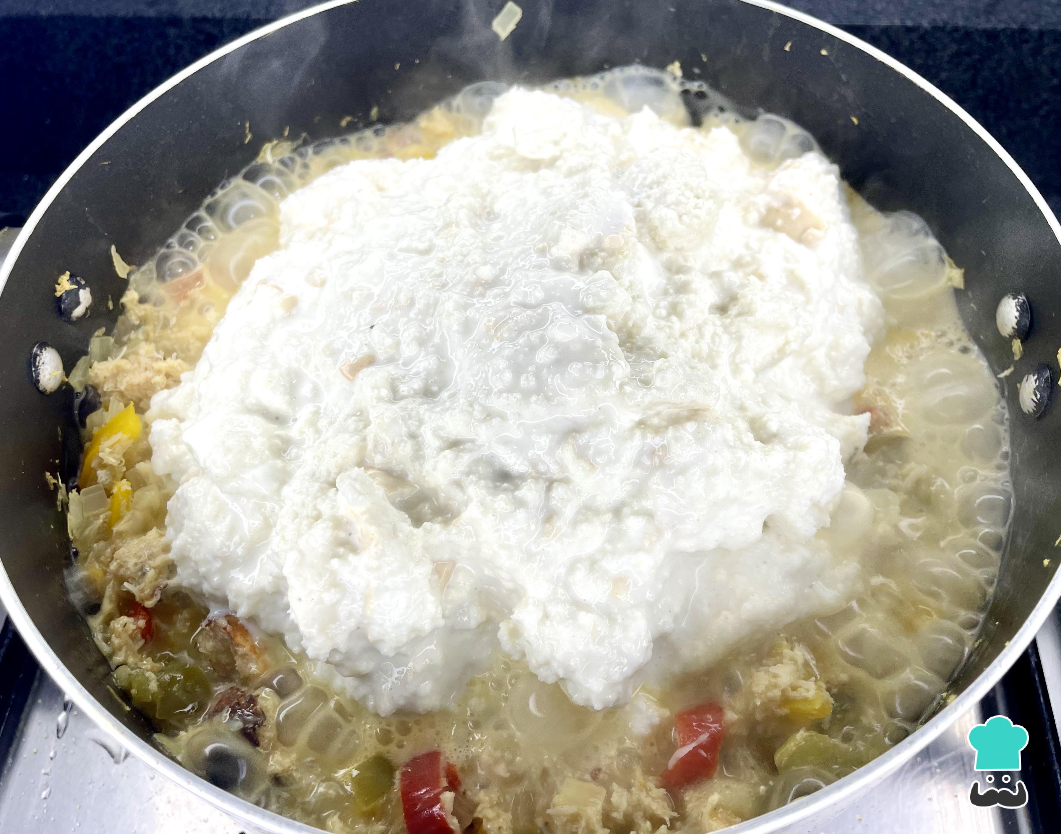 Añade el pan remojado y cocina durante unos minutos. Finalmente, incorpora el queso mantecoso y sazona al gusto con sal y pimienta. Mezcla bien todos los ingredientes.