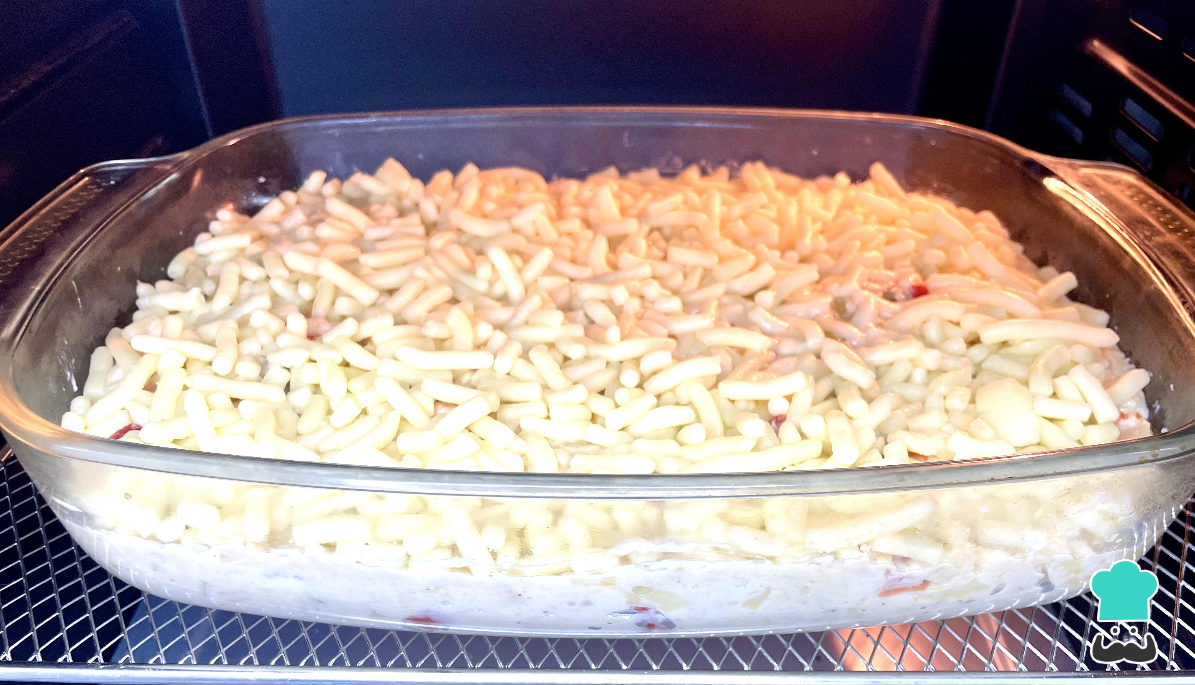 Vierte la mezcla en una fuente apta para horno y espolvorea con queso parmesano granulado o rallado. Lleva al horno.