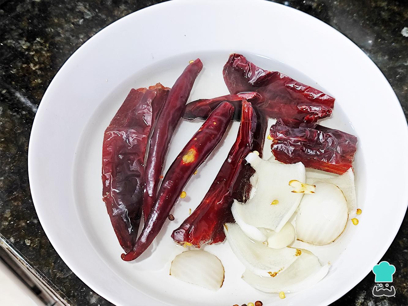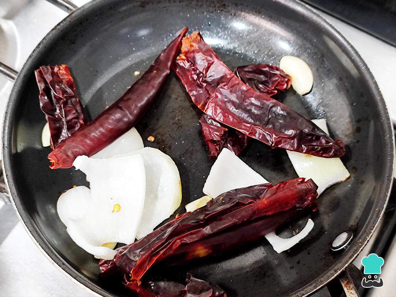 Mientras se cocina la carne, tuesta los chiles en una sartén o comal junto con media cebolla y dos dientes de ajo, dales vuelta de manera continua para evitar que se quemen.
