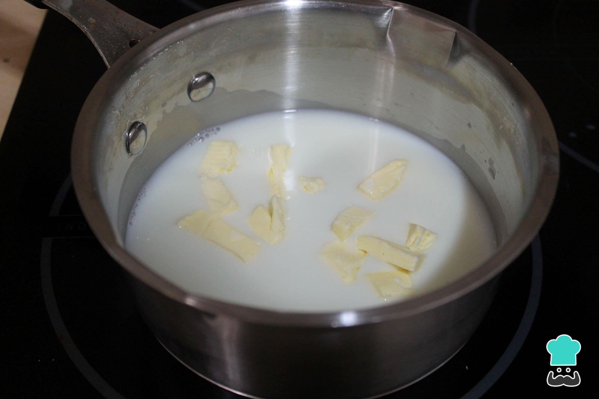 Para empezar con la receta de los churros caseros al horno, en primer lugar prepara la masa. Para ello, pon en cazo o una olla pequeña la harina junto con 2 cucharadas soperas de azúcar y 25 g de mantequilla sin sal troceada. A continuación, lleva a ebullición mezclando de vez en cuando para que se termine de deshacer tanto el azúcar como la mantequilla.