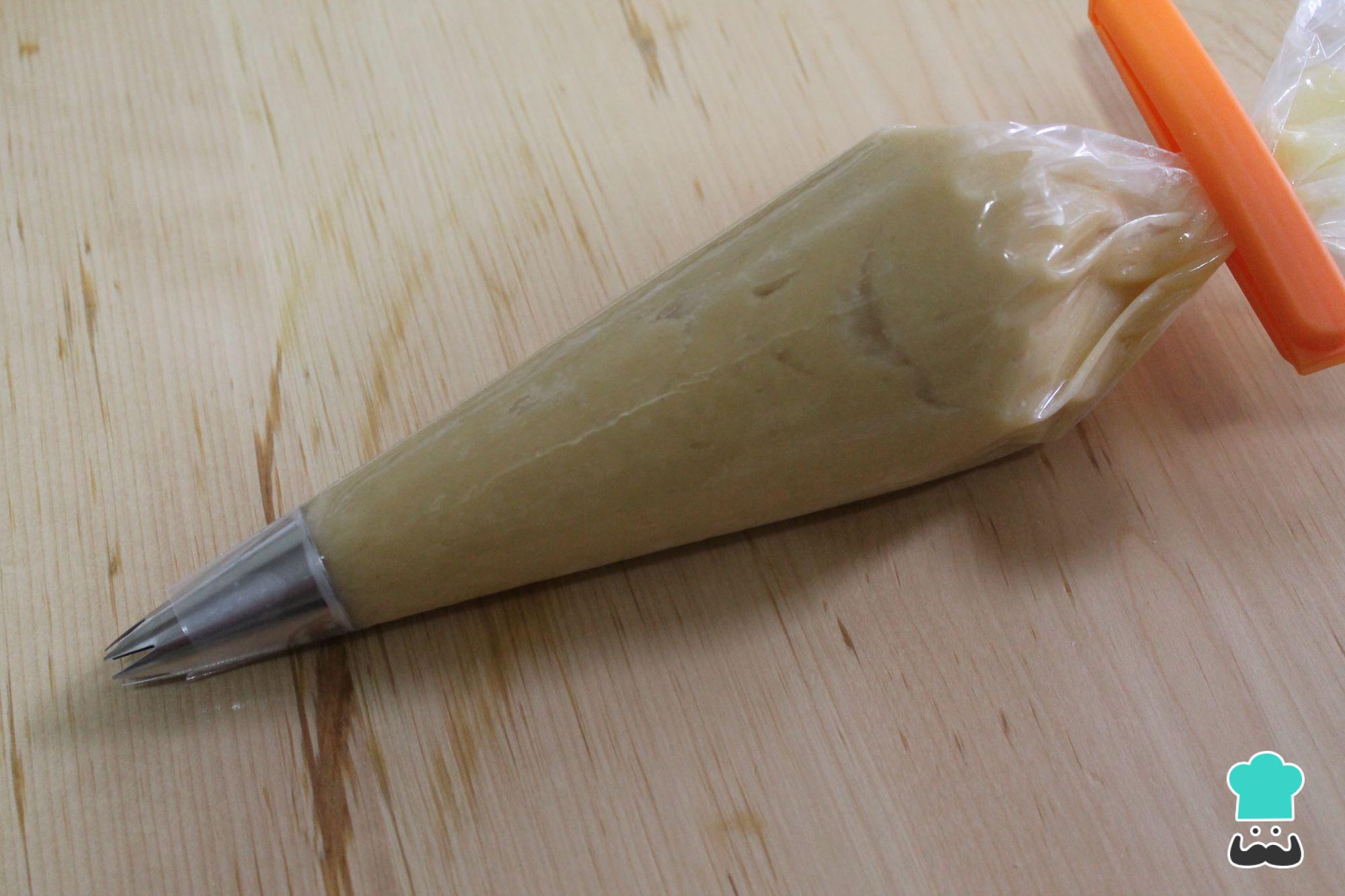 Introduce la masa de churros en una manga pastelera con una boquilla rizada para darle la forma clásica de churro. A continuación, deja reposar la masa mientras precalientas el horno a 180 ºC.
