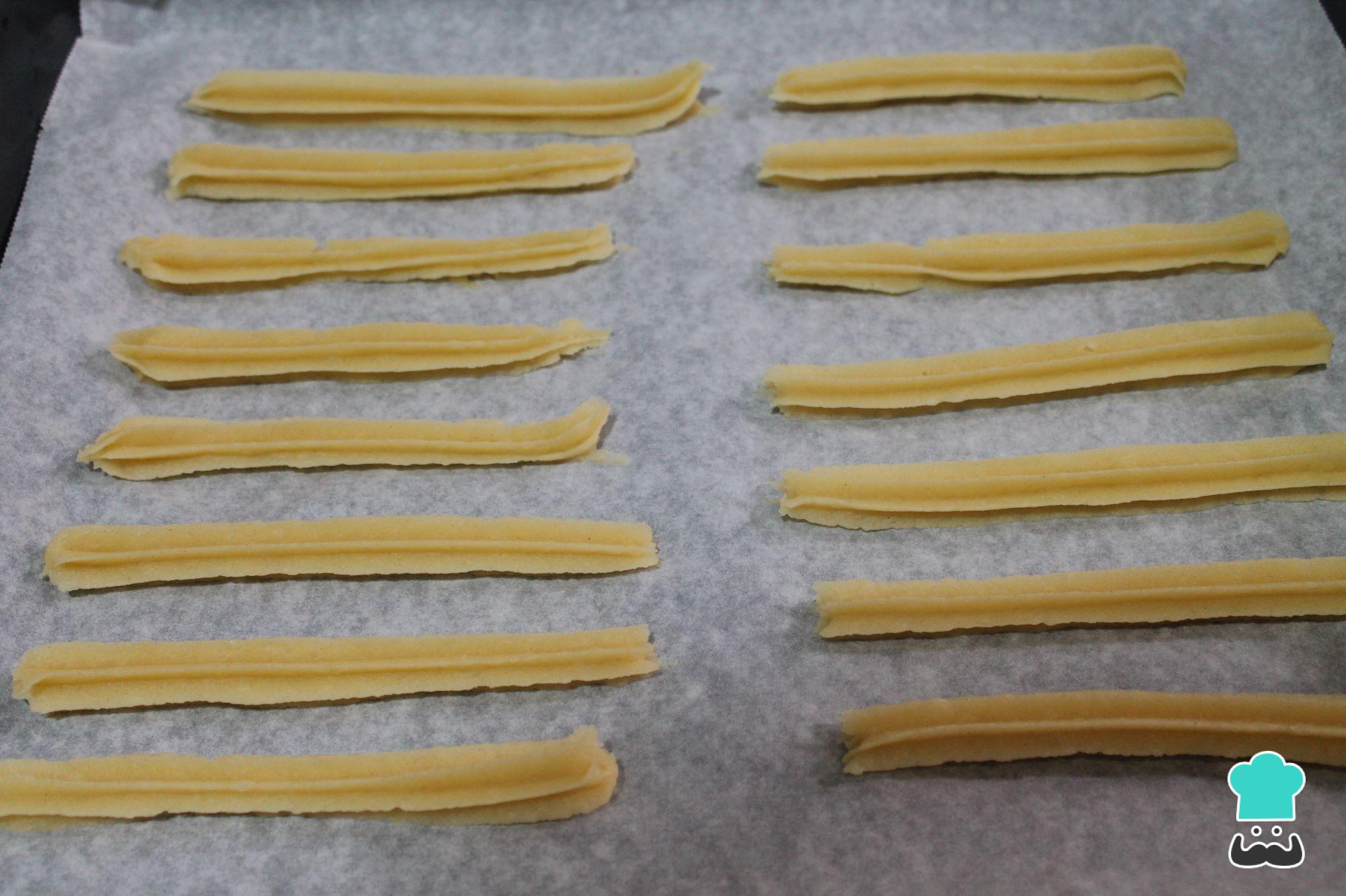 Forra una bandeja con papel de horno. Luego, crea los churros caseros con ayuda de la manga pastelera formando unas tiras alargadas. Coloca los churros separados un poco entre sí en tiras de unos 15 cm de largo aproximadamente.