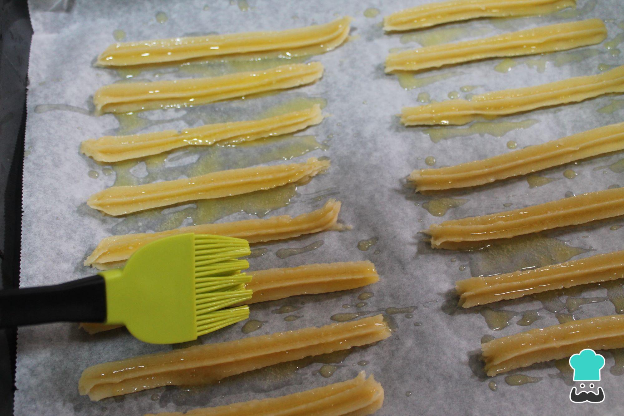 Trocea la mantequilla que ha sobrado y fúndela en el microondas. A continuación, pincela los churros para que queden crujientes una vez horneados. El tiempo de churros caseros al horno dependerá de tu horno, sin embargo, nosotros los hemos cocido a 180 ºC con calor arriba y abajo durante 20-30 minutos.