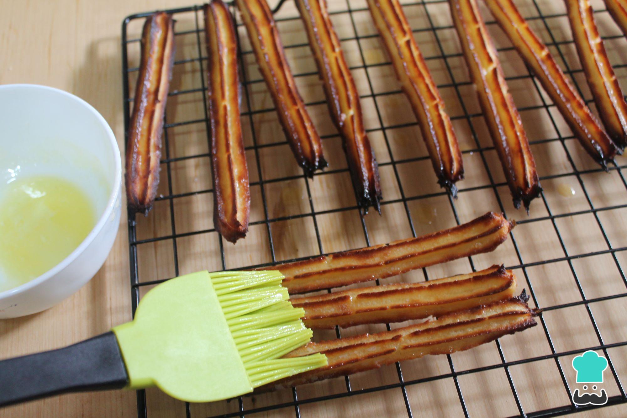 Cuando pase el tiempo de horneado, deja entibiar un poco los churros caseros al horno y pincela de nuevo con el resto de mantequilla fundida para que se adhiera bien el azúcar.