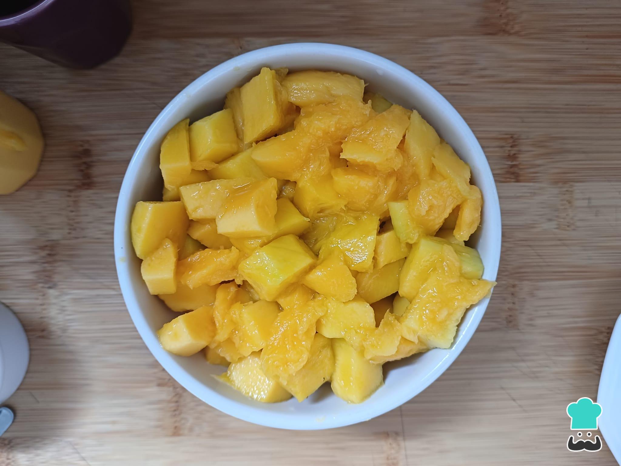 Pela el mango y córtalo en cubos. Reserva.