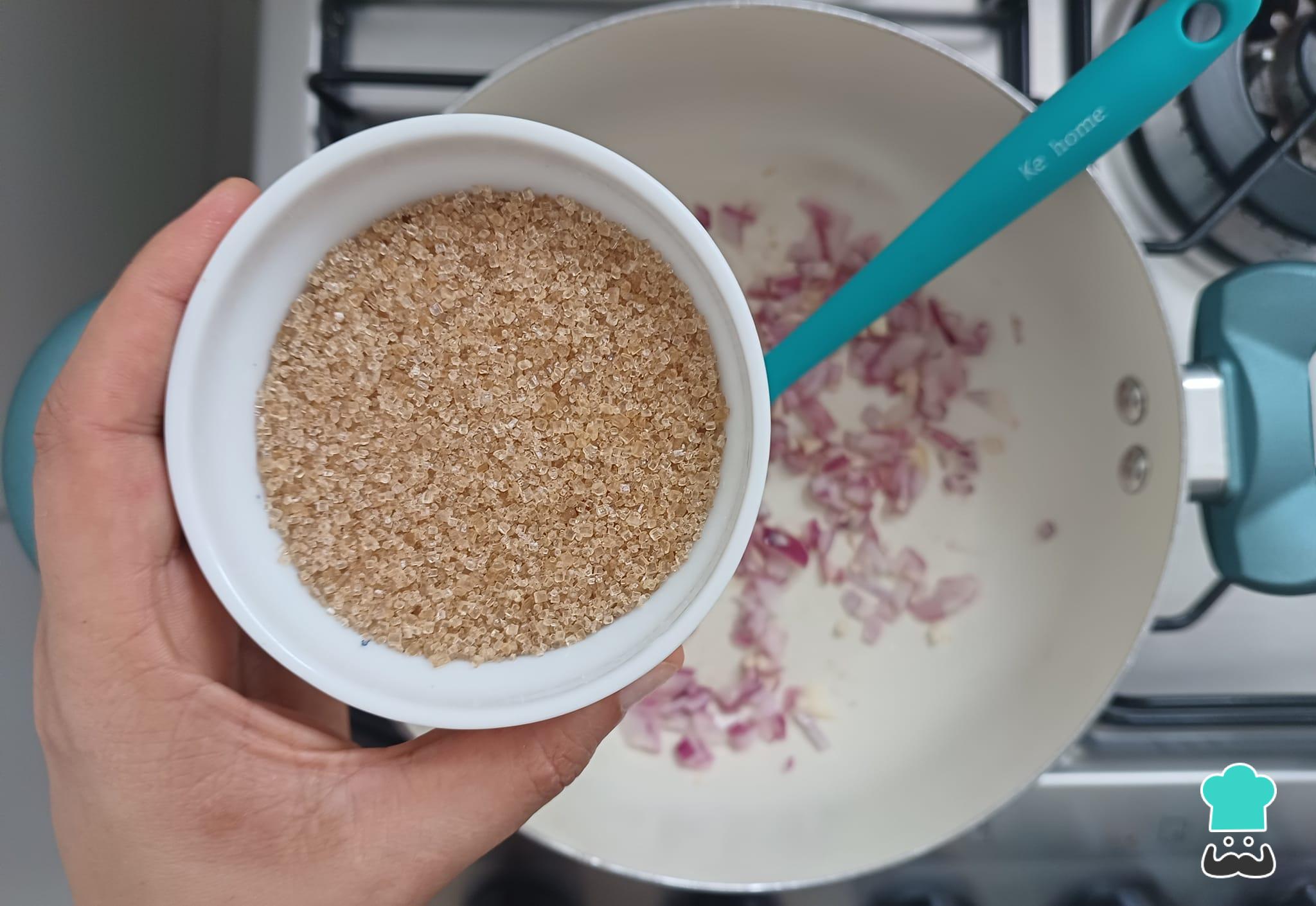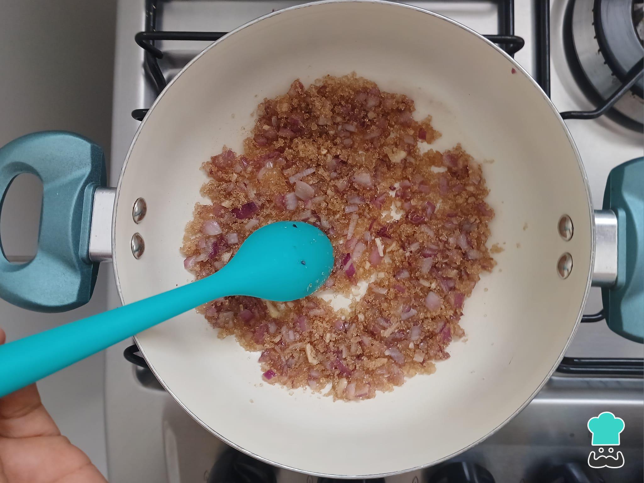 En una sartén sofríe la cebolla y el ajo con el aceite de oliva. Después de sofreír un poco, añade el azúcar y cocina a fuego lento.