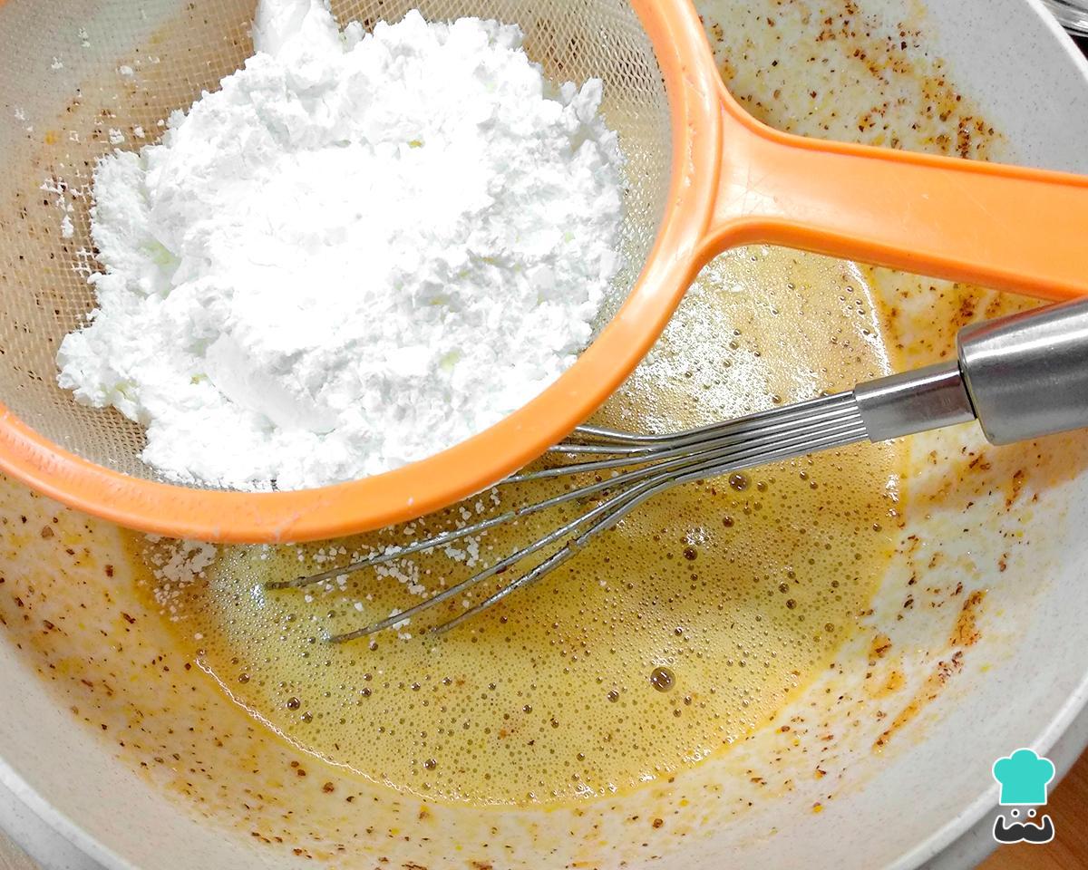 Luego, añadimos la harina de almendras y la maicena, ambas previamente tamizadas para evitar que se formen grumos. Mezclamos con varillas manuales hasta integrarlas. Nosotros hemos utilizados estas harinas para hacer el clafoutis sin gluten, pero si no dispones de ellas puedes utilizar solo maicena, harina de arroz o harina de trigo.