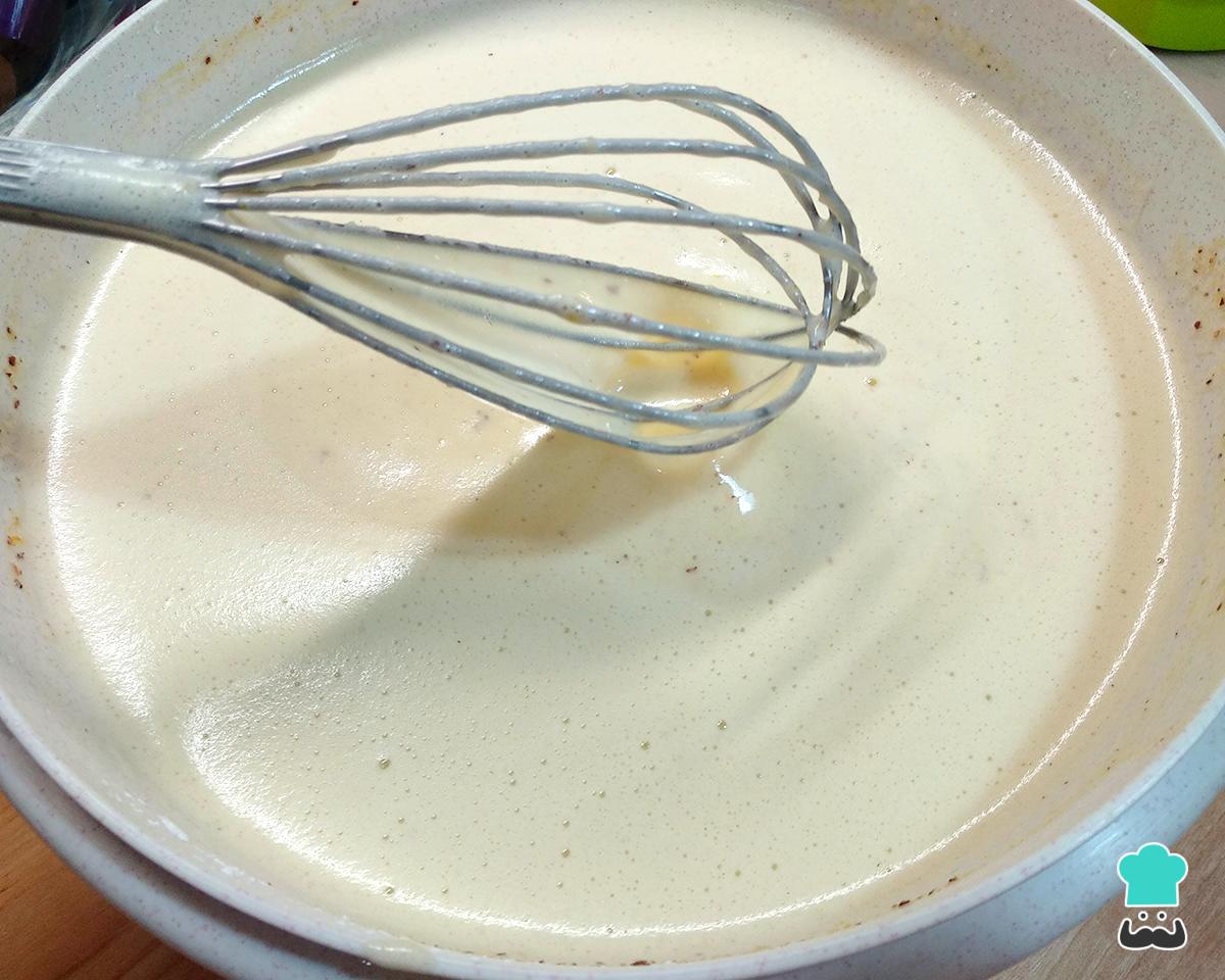 Finalmente, agregamos la esencia de vainilla y la leche y seguimos mezclando. No te preocupes si la masa del clafoutis francés está demasiado líquida, es normal.