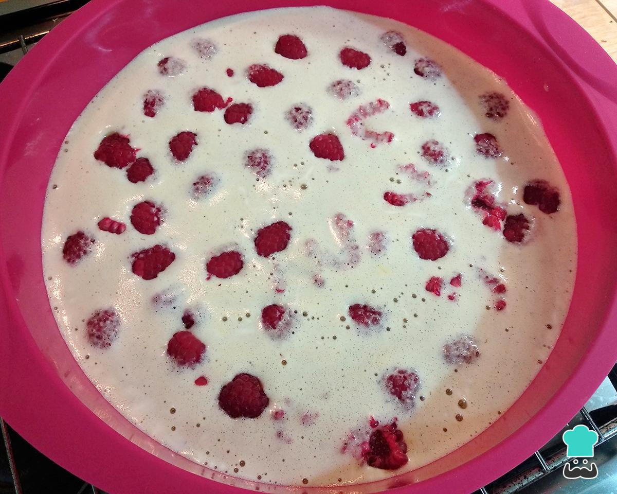Colocamos la masa en un molde preferiblemente de silicona previamente engrasado, de unos 20 cm de diámetro. Después, añadimos los frutos rojos bien distribuidos. Nosotros solo hemos empleado frambuesas, pero se pueden agregar los frutos rojos que se deseen, como arándanos, fresas picadas, cerezas...