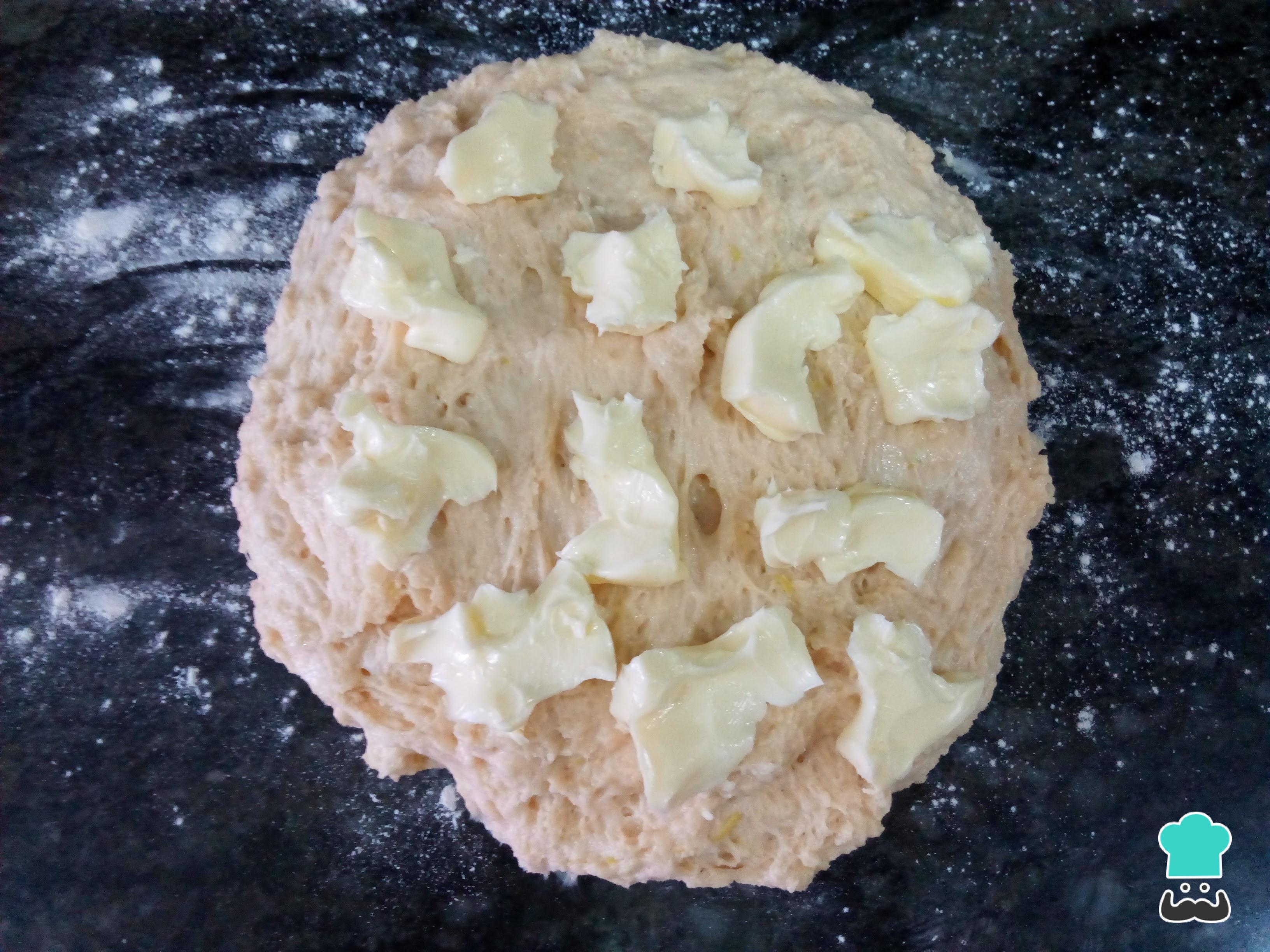 Agrega la mantequilla (que debe estar tipo pomada) y sigue amasando la masa de la coca de brioix a mano. Es normal que la masa se vuelva muy blanda, pero no te preocupes porque con el amasado irá cogiendo más consistencia.