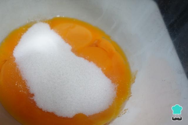 En el bol de las yemas añade el azúcar, bate con unas varillas y mezcla muy bien estos dos ingredientes.