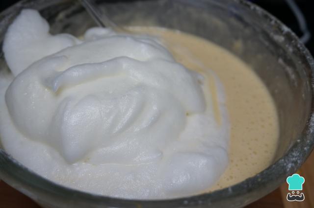 Bate las claras a punto de nieve con unas varillas eléctricas o a mano, estarán listas cuando las claras empiecen a formar picos. Cuando estén listas las claras, añade poco a poco a la masa de la coca María con movimientos envolventes hasta que queden las claras mezcladas.