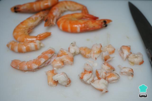 Pela y pica los langostinos cocidos en trozos medianos o pequeños, según más te guste. Reserva un langostino entero por persona para adornar. Puedes comprar los langostinos frescos, cocerlos en casa y darle el punto que te guste.