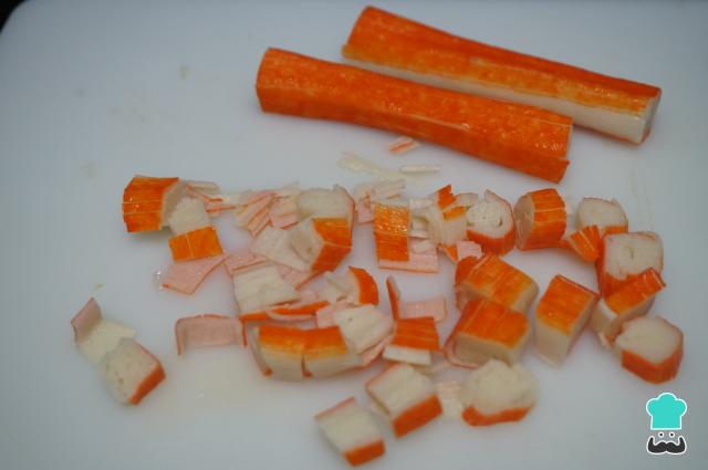 Pica las barritas de surimi, la cantidad de palitos puede ser al gusto.
