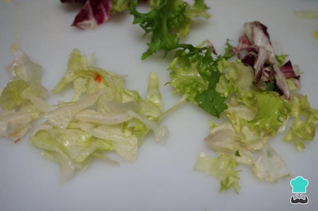 Pica la lechuga y los brotes en trozos pequeños, señalamos que la lechuga se puede poner variada o añadir la clásica lechuga. Reserva los ingredientes en la nevera unos minutos para que permanezcan fríos.
