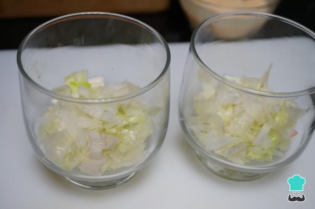 Coge unos vasitos o copas para servir y retira todos los ingredientes de la nevera, deben estar bien fríos. Coloca en el fondo una buena cantidad de lechuga. ¡Ya casi está la receta de cóctel o ensalada de marisco!