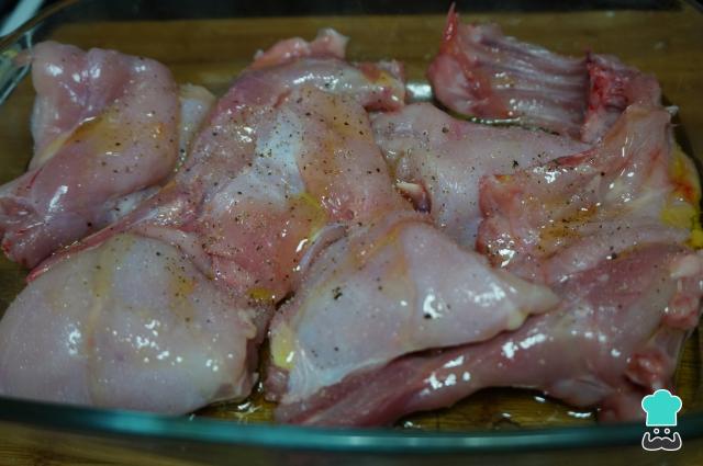 Para empezar con esta receta, primero debes limpiar el conejo, retirando la grasa. Cuando lo hayas limpiado, debes cortarlo en trozos. Seguidamente, enciende el horno a 200 ºC con calor arriba y abajo. Recuerda poner los trozos de conejo en una fuente apto para horno. Después, debes salpimentar los trozos de conejo y añadir un chorro de aceite de oliva.