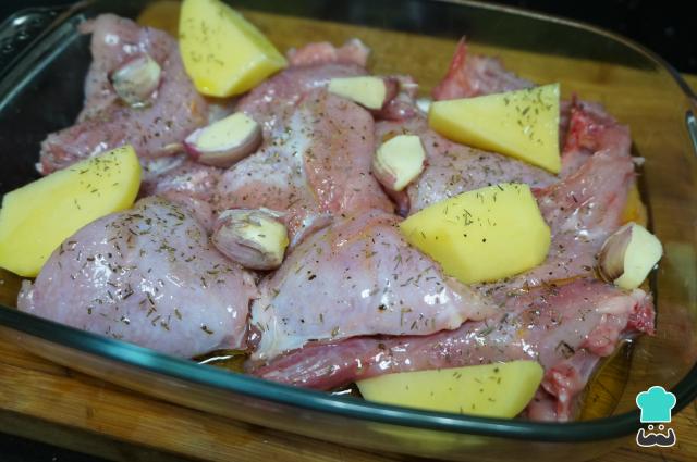 Debes pelar los dientes de ajo y añadirlos a la fuente en la que tenemos el conejo. Ahora, pela las patatas y, si son pequeñas, cortarlas en cuartos. Si, de lo contrario, las patatas son grandes, debes cortarlas en 6 trozos para que se cocinen a la vez que el conejo. Posteriormente, echa un poco de sal y aceite a las patatas. Simultáneamente, debes espolvorear un poco de tomillo seco o fresco por toda la fuente. Por último, debes meter al horno unos 15 minutos.