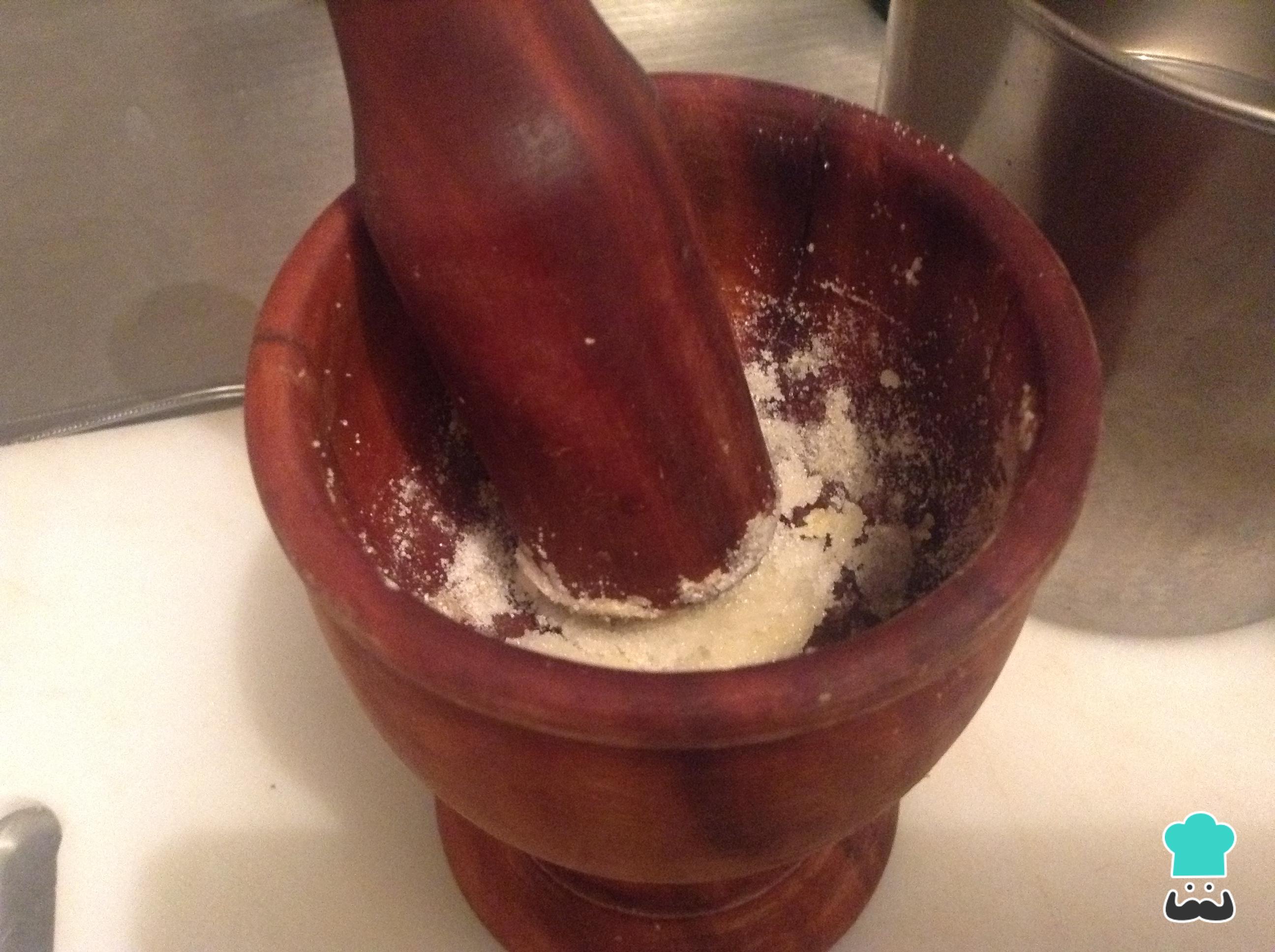 En un mortero triturar los ajos junto con 1 cucharadita de sal.