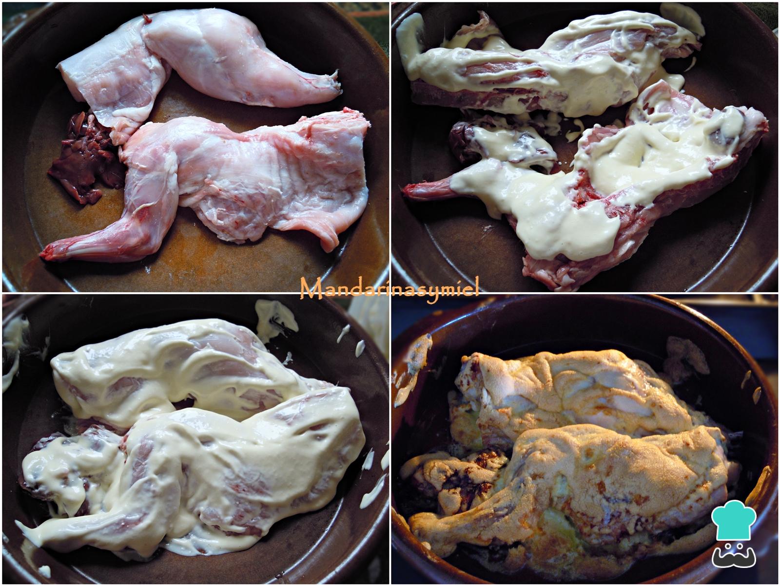 Unta un lado con una buena cantidad de ajoaceite, dale la vuelta y termina tapando cada trozo con el resto de alioli. El ajoaceite para el conejo al horno puedes comprarlo hecho o prepararlo tú en casa.