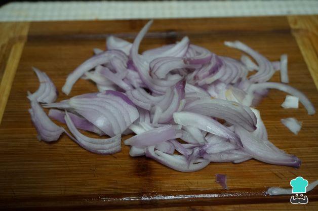 Empieza con la receta de conejo con cebolla fácil. Para ello, pela las cebollas y córtalas en tiras.