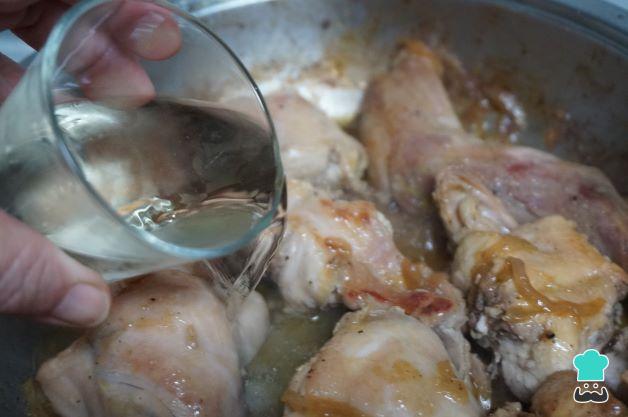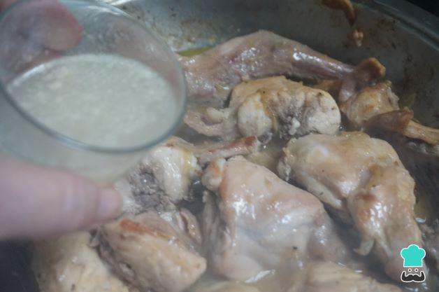 Cuando esté dorado el conejo y la cebolla esté pochada o con un poquito de color, añade el vino blanco, déjalo se cocine con el vino blanco y se evapore el alcohol, 10 minutos aproximadamente.