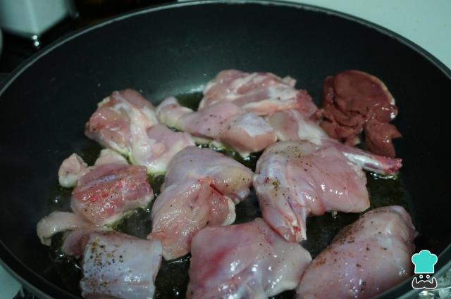 Para empezar con la receta de conejo guisado con almendras, primero limpia el conejo y trocéalo. A continuación, salpimienta y añade en una cazuela un chorro de aceite a fuego fuerte, incorpora el conejo y dóralo. Cuando esté dorado, retira y reserva.