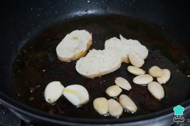 En la misma cazuela, añade un poco más de aceite e incorpora las almendras crudas, los dientes de ajos pelados y las rodajas de pan. Conforme se vaya dorando, retira de la cazuela. Primero retira el pan, que se dorará enseguida y se puede quemar. Luego, los ajos y, finalmente, las almendras. Coloca los ingredientes en un vaso o batidor. Si te gusta el hígado, también puedes freírlo y añadirlo junto al majado de las almendras y triturarlo, esto espesará más la salsa. ¡El conejo en salsa de hígado también está delicioso!