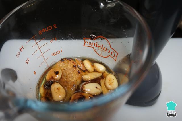 Añade los ingredientes que has tostado en el vaso batidor e incorpora un poco de agua o caldo y tritura hasta que quede todo bien triturado sin trocitos.
